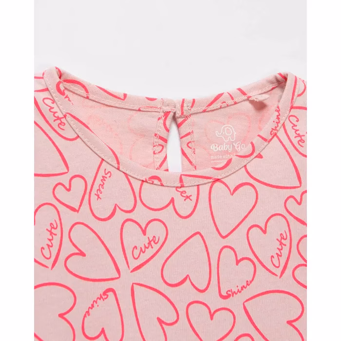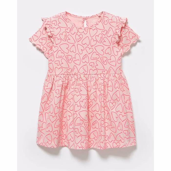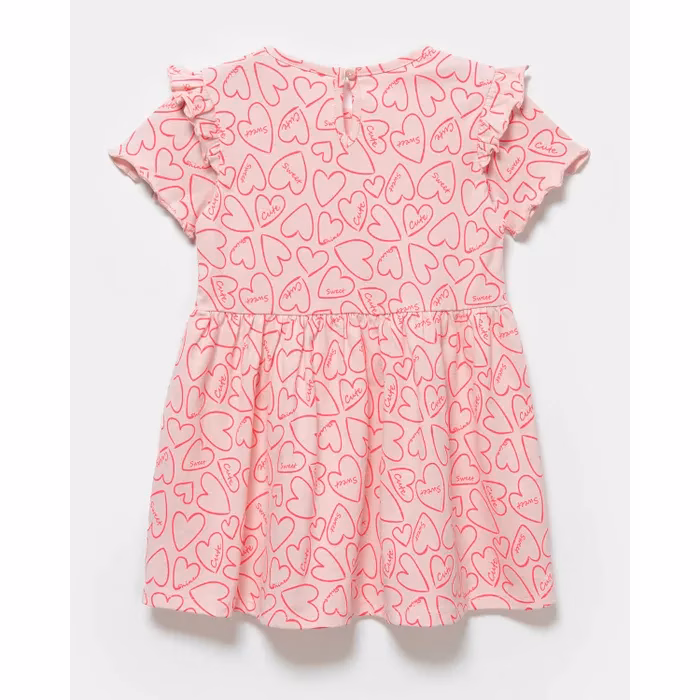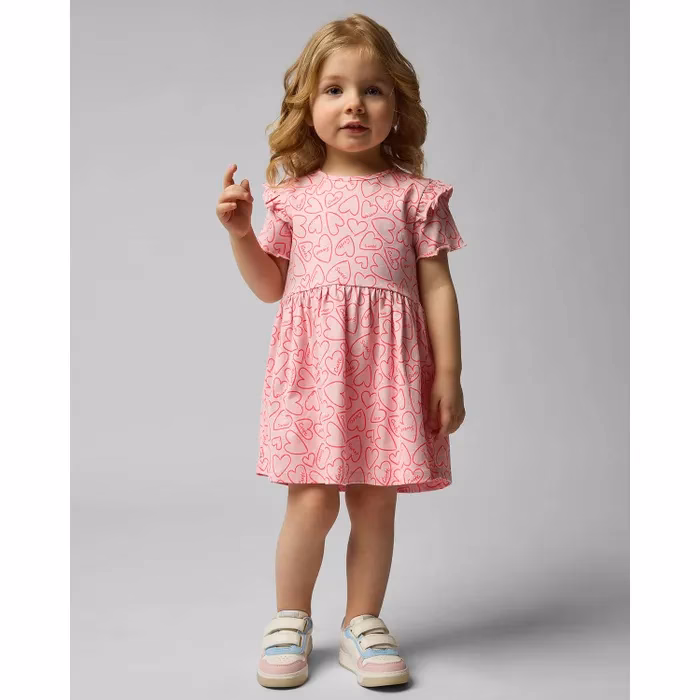 - Pink Baby Go dress for girls, decorated with ruffles and heart print.