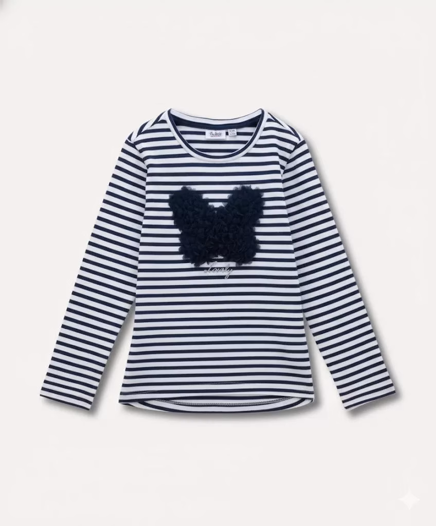 Blu Kids Lovely Butterfly Logo Striped Full Sleeves Tee Navy/White