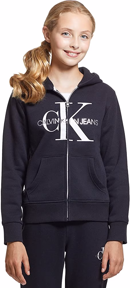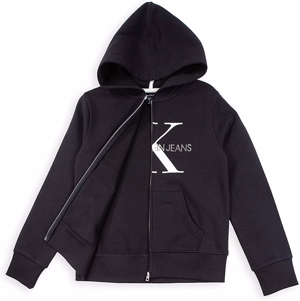 - Update her essentials with this foil monogram hoodie from Calvin Klein Jeans, featuring zip-up design with pouch pockets in signature style, hood full zip front, interior locker loop, Long sleeve ribbed cuffs, and ribbed hem; two pouch pockets
