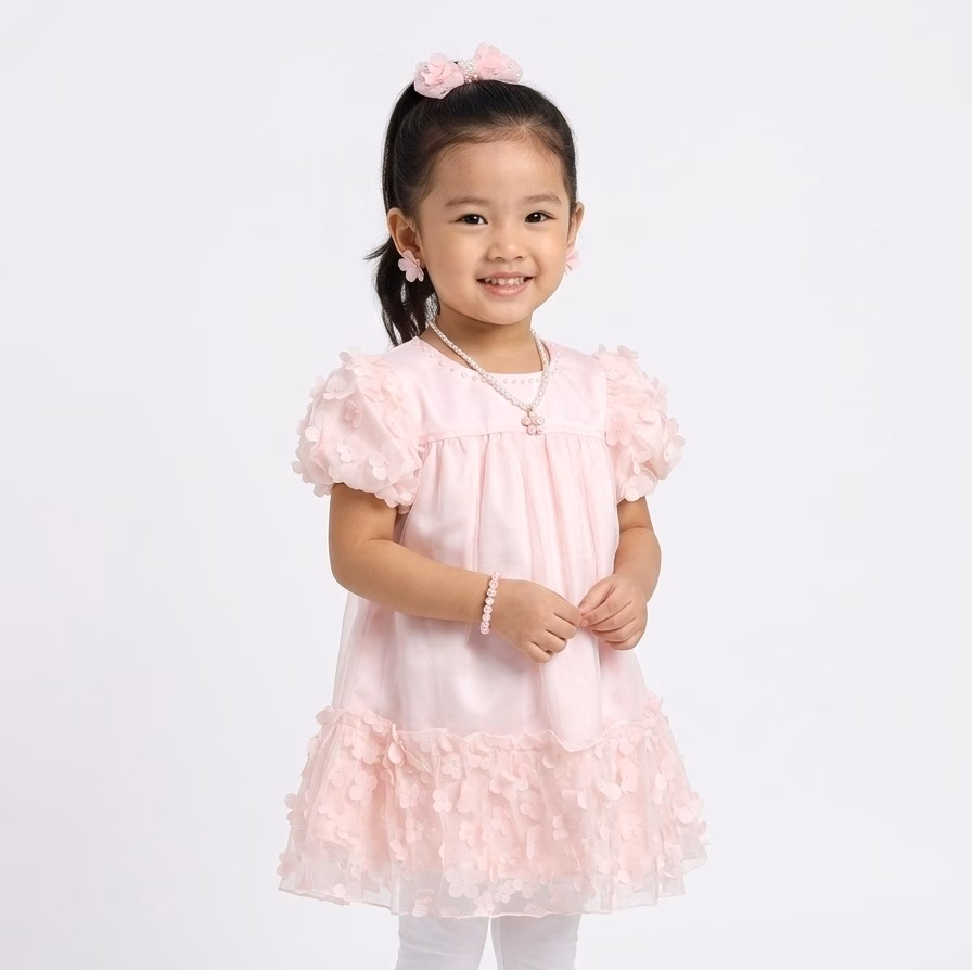 The dress is crafted in a soft ballet-pink satin base with a sheer organza overlay, giving it a gentle, luminous glow.