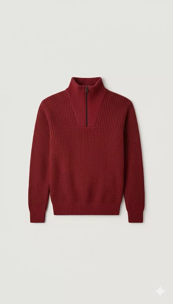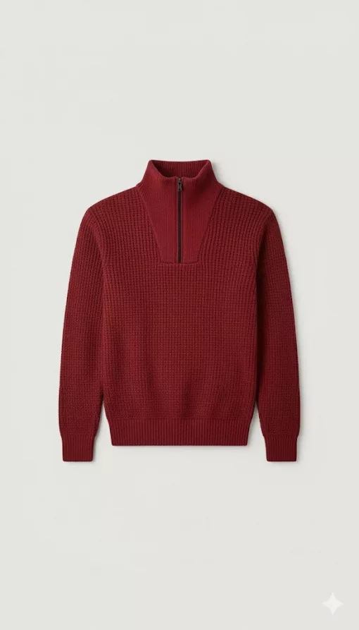 A classic, chunky knit sweater perfect for layering. This half-zip pullover features a substantial ribbed texture and a stand collar to lock in warmth. Its rich, deep color and comfortable, true-to-life fit make it a versatile staple for cooler weather.