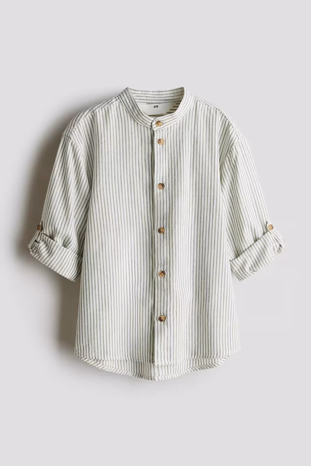 Shirt in a soft, airy cotton and linen weave. Features a grandad collar, buttons down the front and long sleeves with a button tab. Gently rounded hem that is longer at the back.