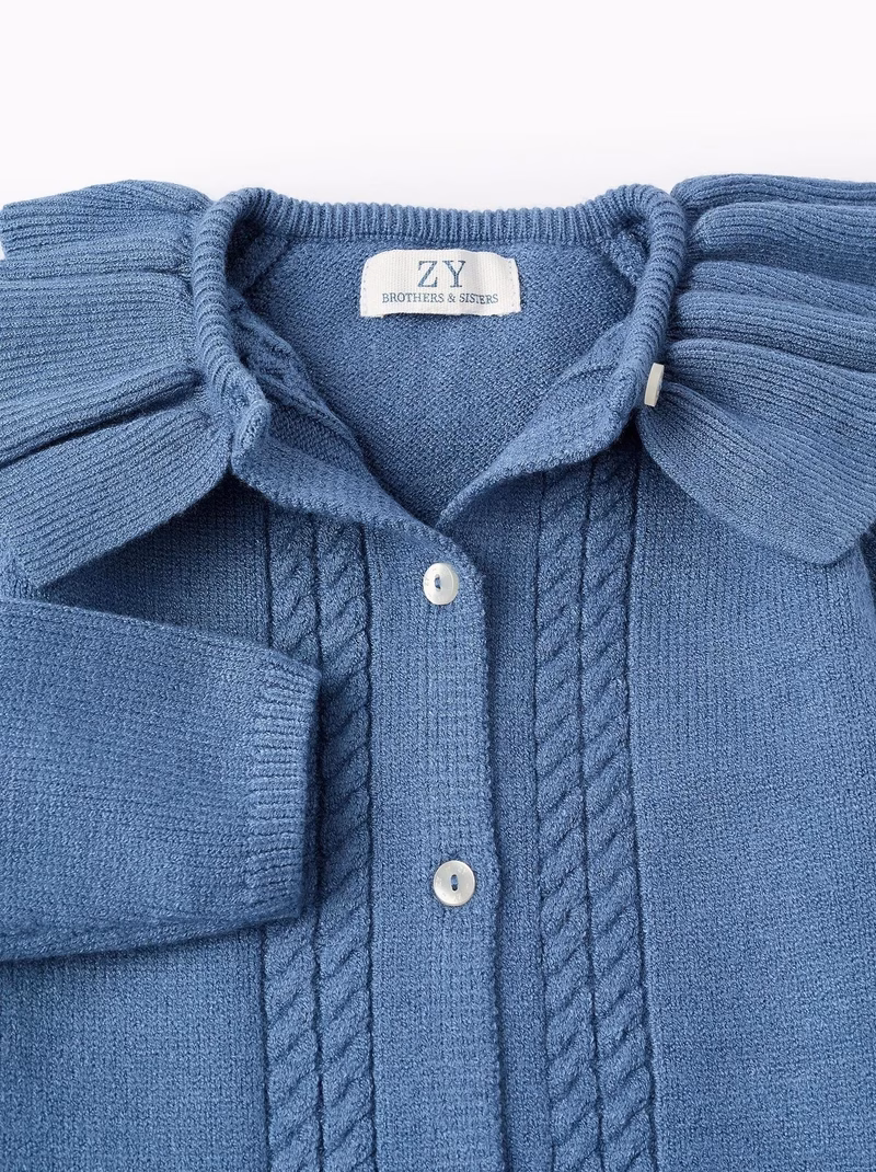 Baby blue knit cardigan with braided details. Ruffled collar. Contrasting mother-of-pearl buttons. Ribbed cuffs and hem for a perfect fit. A soft and comfortable cardigan, ideal for layering with other pieces from the same collection.