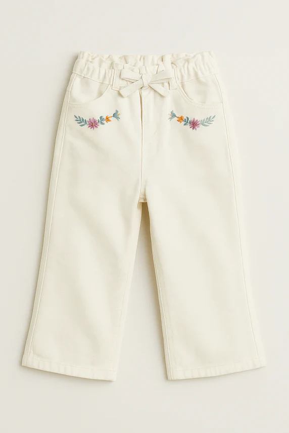 Give your little one a stylish and comfortable look with these Max Girls Embroidered Cream Jeans. Designed for newborns up to 5 years, these jeans feature delicate floral embroidery with a cute bow detail on the waist. The soft and breathable fabric ensures all-day comfort, making them perfect for playtime, outings, or casual wear.