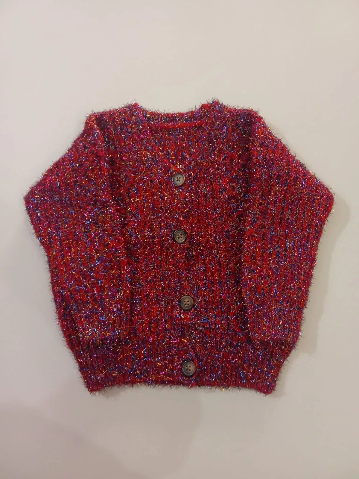 - Speckled Fleck Design:Â The rich red yarn is interwoven with multi-colored specks, adding depth and a unique visual texture to the garment.