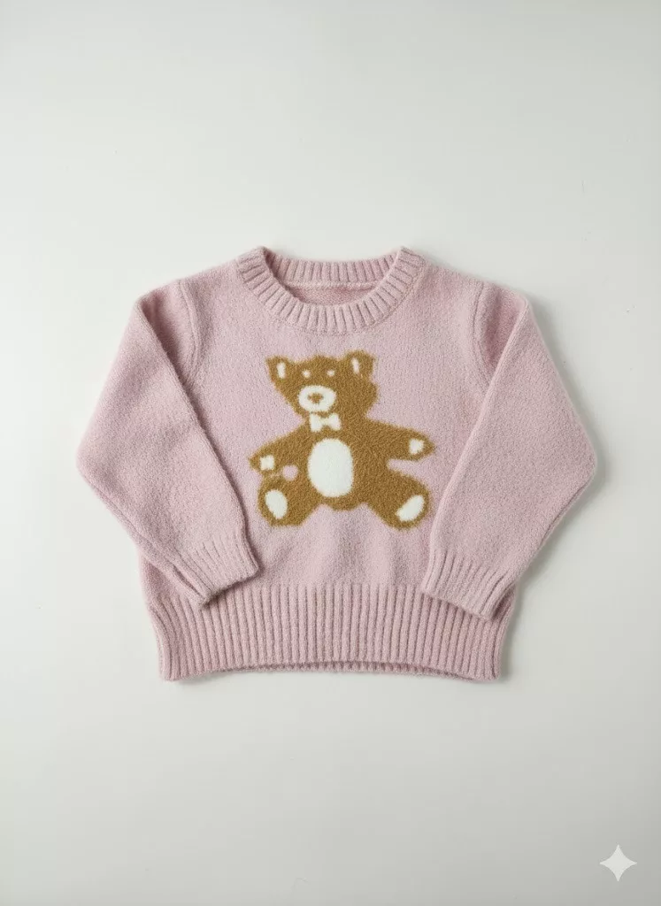 Keep your little one snug and stylish in this soft-knit, long-sleeved pullover. Featuring an adorable teddy bear intarsia design on a delicate pink background, this jumper is perfect for keeping your baby warm and comfortable on chilly days.