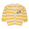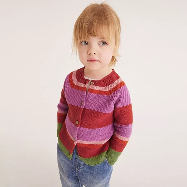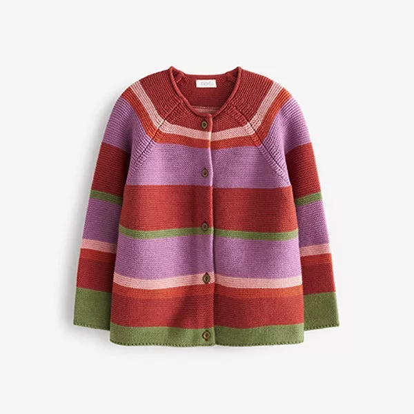 A supersoft cotton cardigan with a colourful stripe pattern. This cute cosy knit has a rounded neck, wooden buttons and a textured appearance.