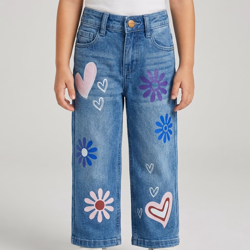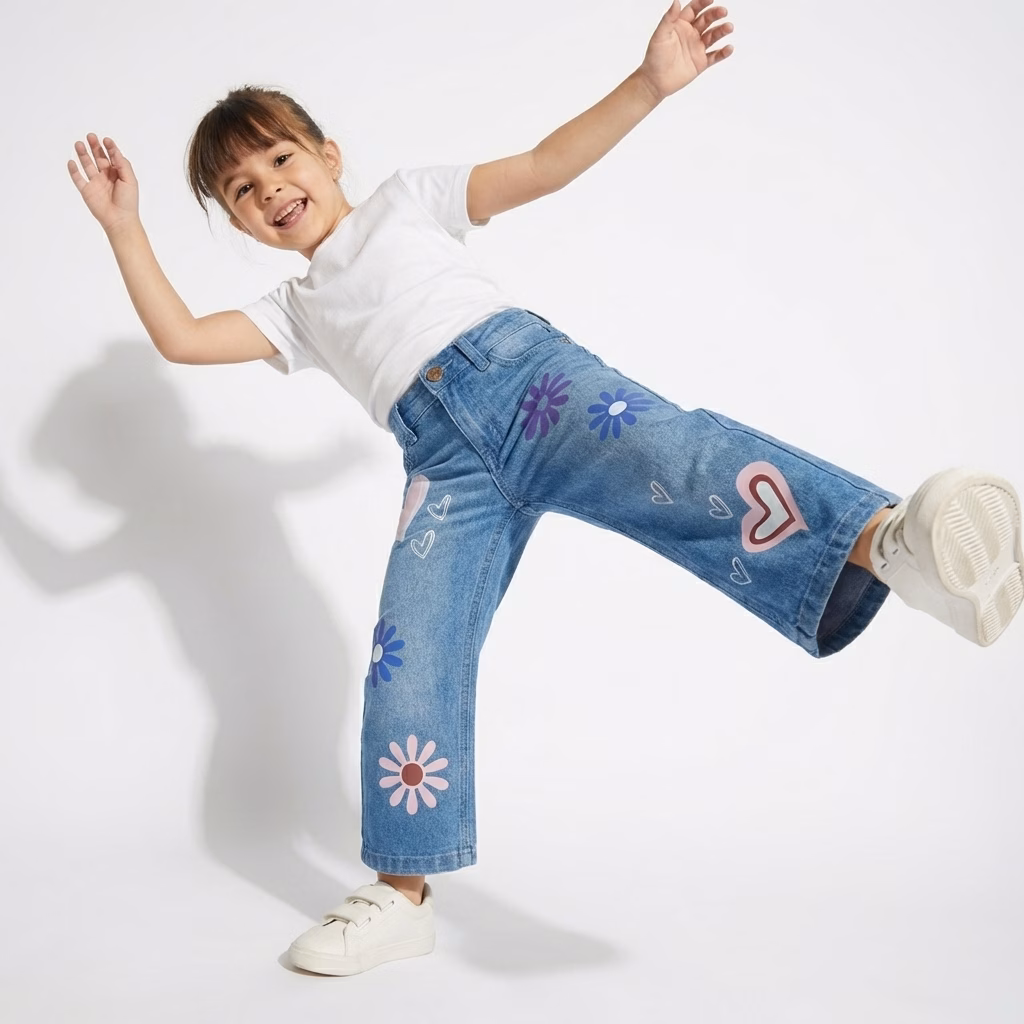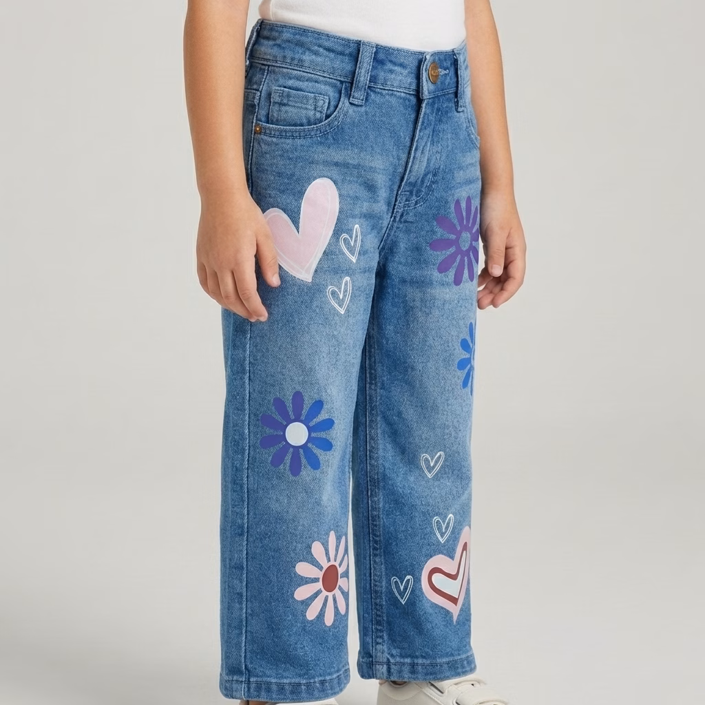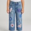 SARA Girls Playful Printed Loose Fit Soft Denim – Medium Blue Wash