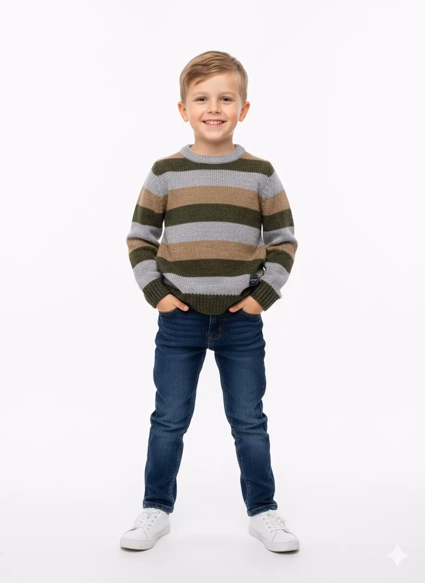 This cozy striped sweater, featuring earthy tones.Its comfortable knit and classic design make it a versatile addition to any young one’s wardrobe.