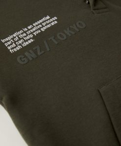 - Hoodie with long sleeves and cuffs. Zip and snaps on the yoke, front pocket. Embossed lettering on the chest and back.