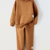 Two-piece set. Sweatshirt with a high neck and long sleeves. Ribbed trims. Zip fastening on the front yoke. Label appliqué on the chest. Trousers with an elastic waistband and adjustable front drawstrings. Front and back patch pockets. Brushed inner fabric, warm and soft.