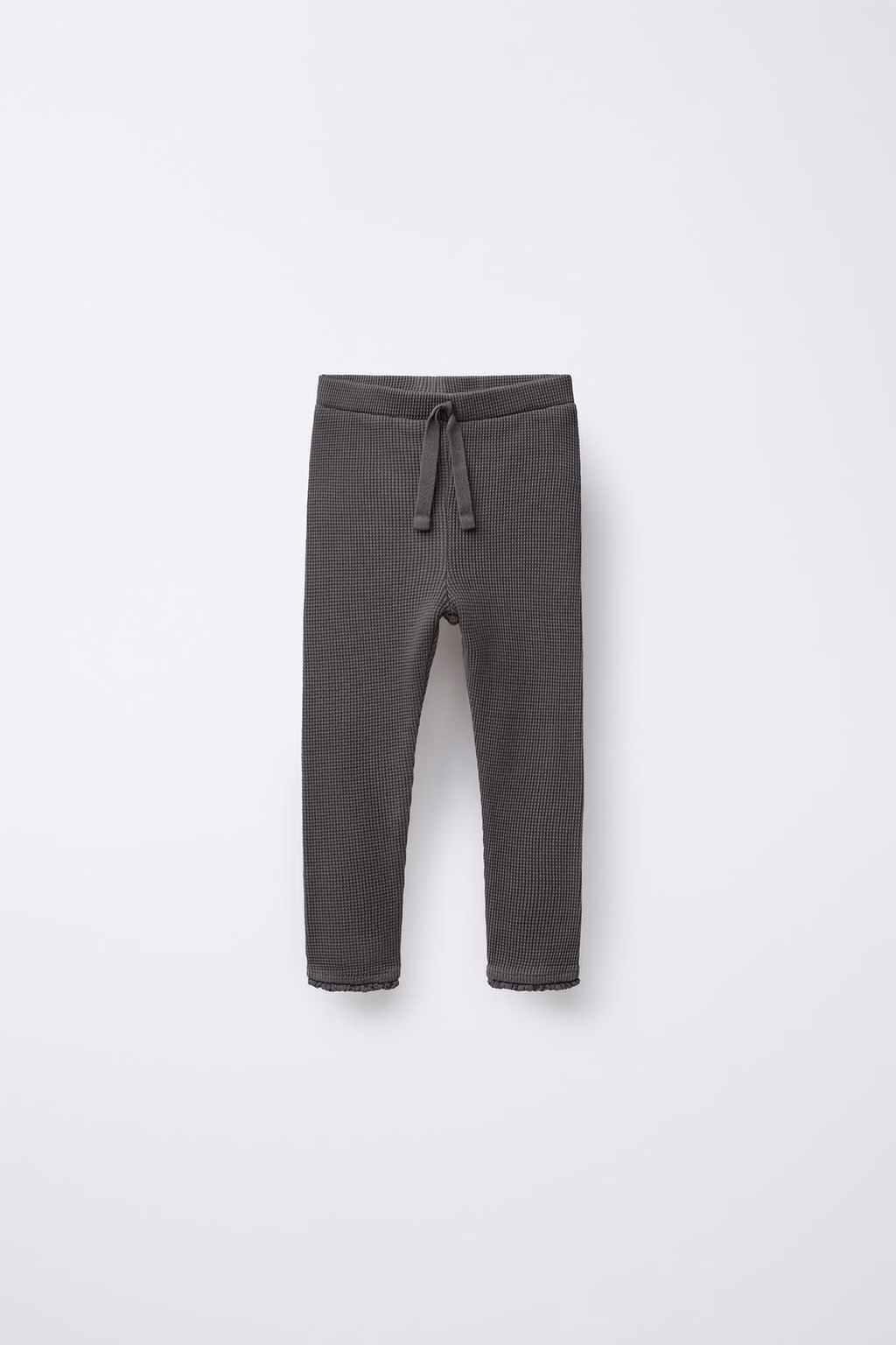 Waffle-knit leggings with an elastic waistband and front drawstring detail. Lace trim detail on the hems. 100% cotton fabric.